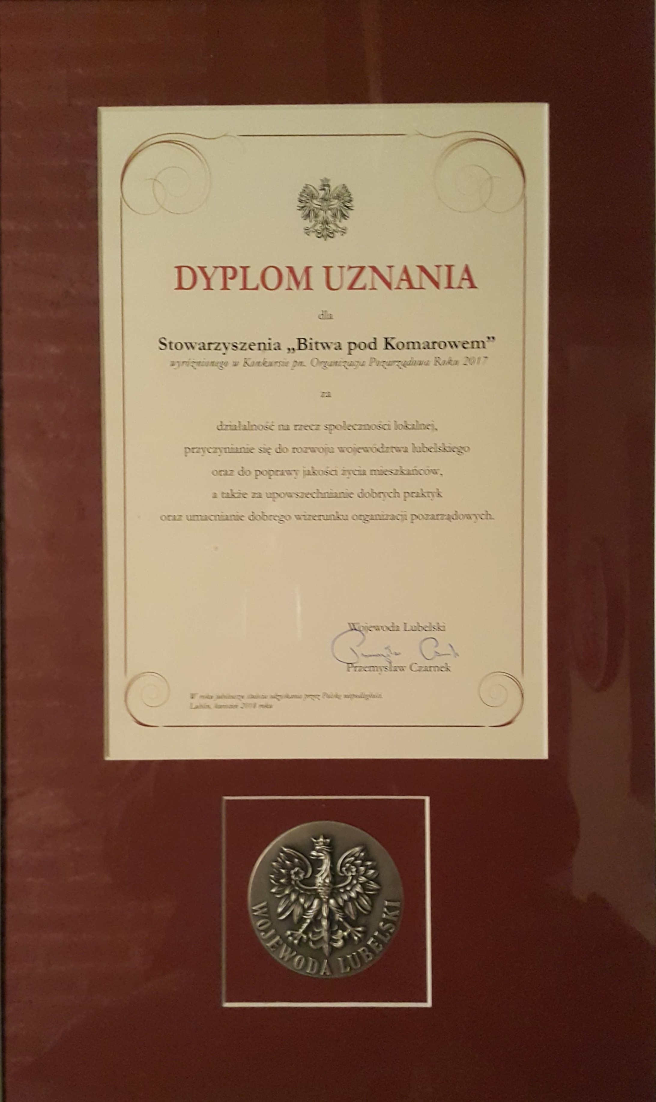 Z radością informujemy o wyróżnieniu Stowarzyszenia Bitwa pod Komarowem w konkursie "Organizacja Pozarządowa roku 2017" zorganizowanym przez Lubelski Urząd Wojewódzki. To dla nas zobowiązanie do dalszej pracy oraz dalszego podnoszenia świadomości społeczeństwa etosie Bitwy pod Komarowem.