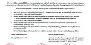 Członkowie Sztabu KP uczestniczyli w wydarzeniu jakim był Bal Ułański 11 Pułku Ułanów Legionowych 1920 – 2020. Setki zdjęć, które będą się pojawiały w internecie pokażą jak wspaniała atmosfera panowała tej nocy. Dla nas ten czas miał wymiar szczególny a zarazem symboliczny. Życzliwość jaką otrzymaliśmy dała poczucie kawaleryjskiej więzi. Przedstawiona i podpisana Deklaracja Wsparcia pomiędzy Szwadronami w barwach 11 pułku a SBpK jest świadectwem, że Święto Kawalerii i budowa Pomnika jest wspólną potrzebą – Komarowską Potrzebą. Dowodem na ogromne zaangażowanie były przeprowadzone w trakcie balu aukcja na rzecz budowy Pomnika, które przyniosły aż 16 000,00 zł . Należy wspomnieć , iż ochotnicze szwadrony w barwach 11 PUL wcześniej już wsparły budowę przekazując kilka tysięcy złotych. Ilość przedmiotów wystawionych na aukcję jest kolejnym dowodem na ogromne zaangażowanie. W trakcie balu Komendant Komarowskiej Potrzeby miał zaszczyt wznieść pierwszy toast a następnie przedstawić obecny etap prac przy budowie Pomnika jak też podziękować za okazywane wsparcie.